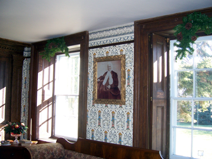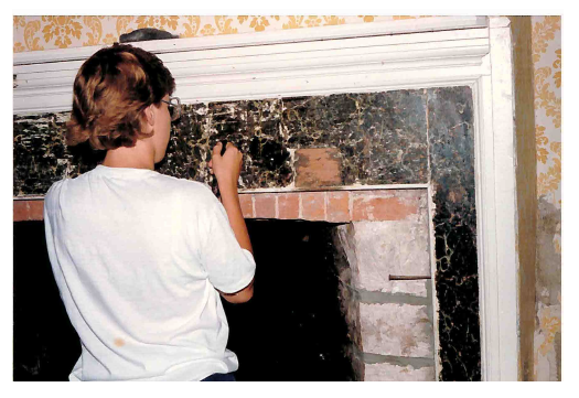 The faux finish on the window wells, built-in bookcases, and fireplace mantle did not need to be restored. The Ireland family left the finish intact for four generations.